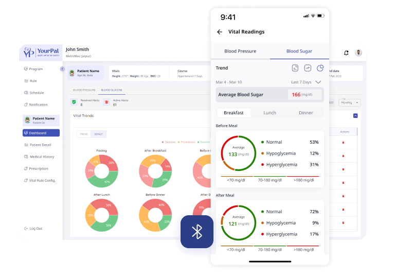 YourPal is a platform for Remote Patient Monitoring that focuses on managing patients who could be in a danger zone or advised constant monitoring. This platform includes a patient app for iOS and Android devices, such as phones and tablets, which wirelessly collects data from monitoring devices like Glucometers. The collected data is then sent to YourPal App on the cloud for analysis.
