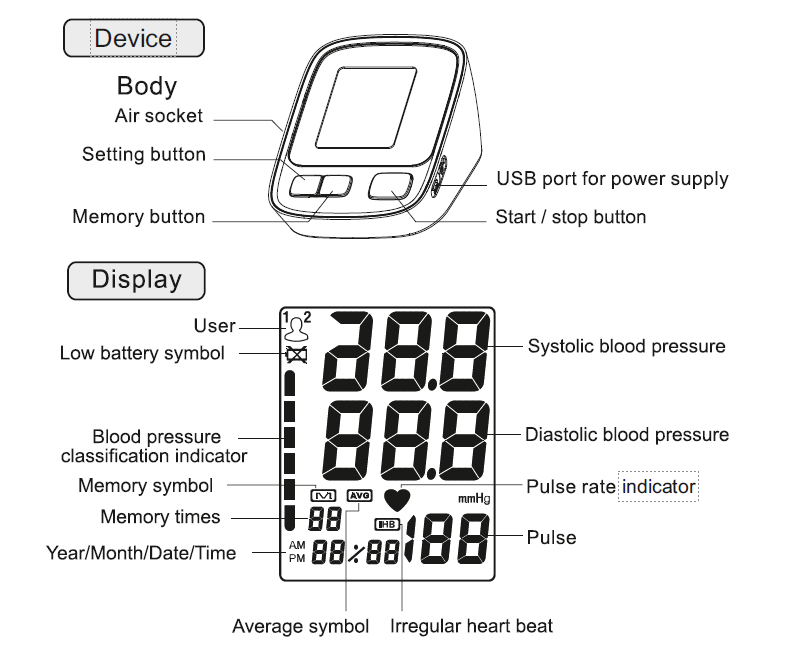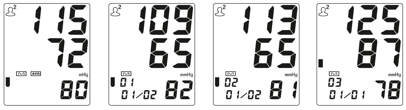 The device stores the blood pressure and the pulse rate in the memory after completing each measurement. It can automatically store 99 sets of measurement values for two users. The oldest record is deleted to save the latest measurement value for each user reading reaches more than 99 sets.