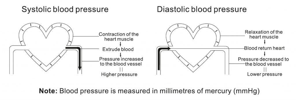 The systolic blood pressure value (higher pressure or top value) represents the blood pressure praduced by contraction of the heart muscle.